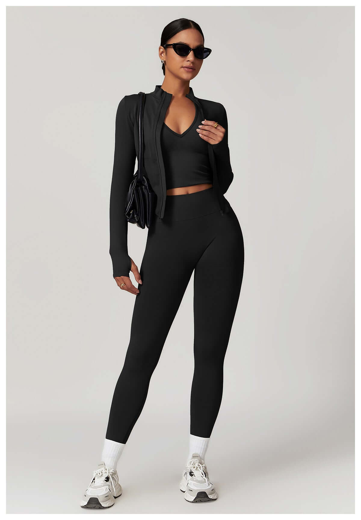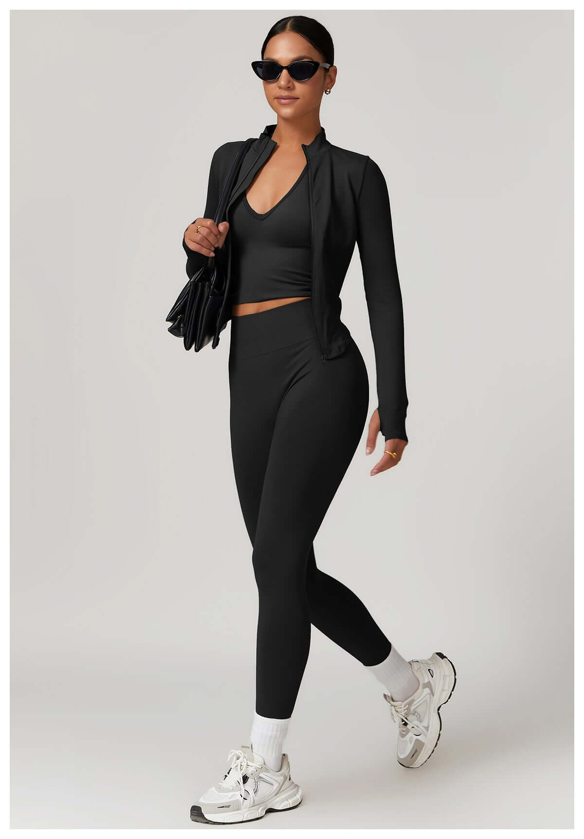 Meet your new favorite fit: the Black Three-Piece Set — designed for the woman who does it all and wants to look good doing it. This set includes a sculpting sports bra, high-waisted leggings, and a matching long-sleeve shrug to complete the look.