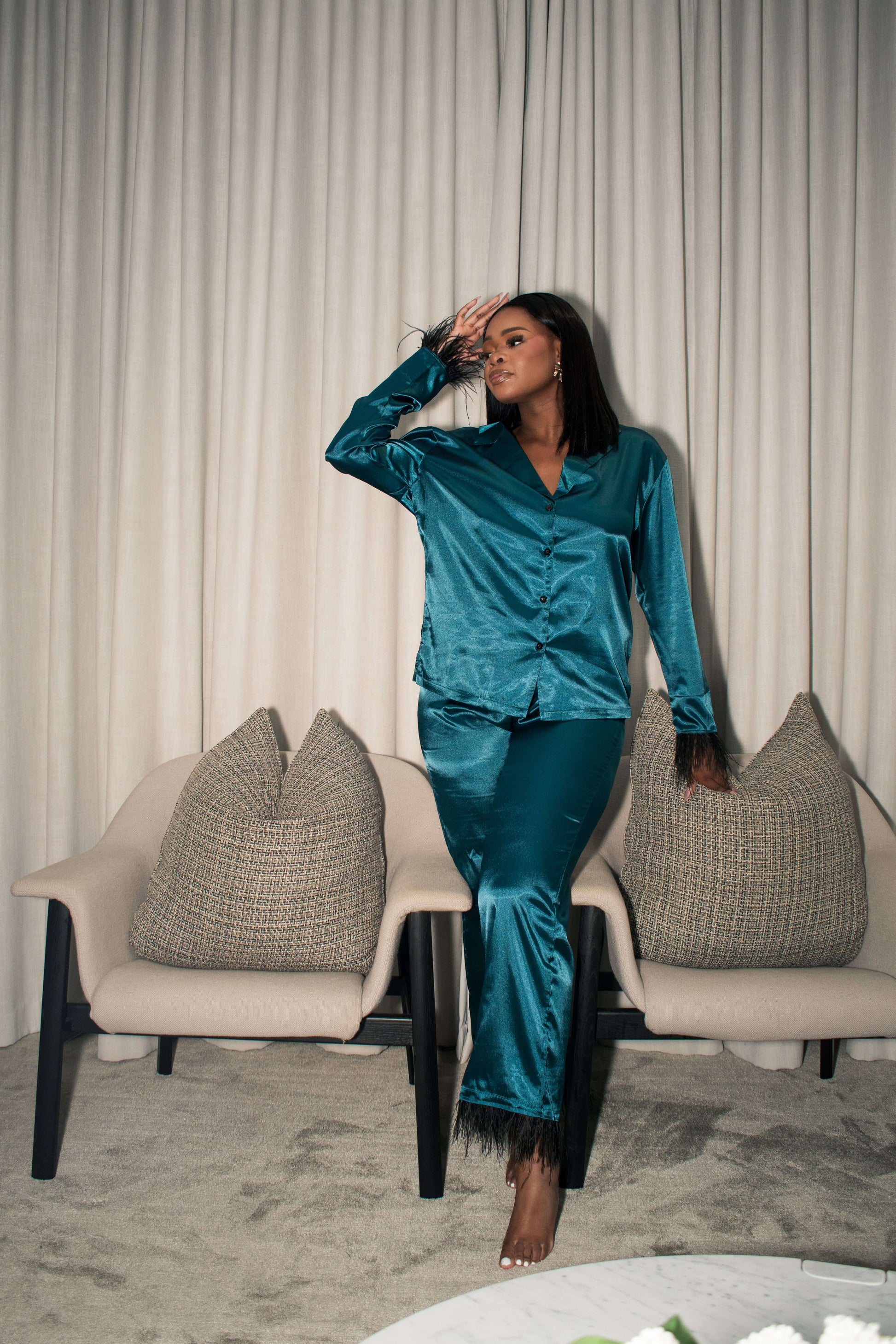 Elevate your loungewear with our Feathered Emerald Luxe Satin Set — where rich emerald satin meets delicate feather trim for the ultimate in elegance and comfort. This pajama set is crafted from smooth, high-shine satin that feels silky-soft against your skin and moves effortlessly with you.