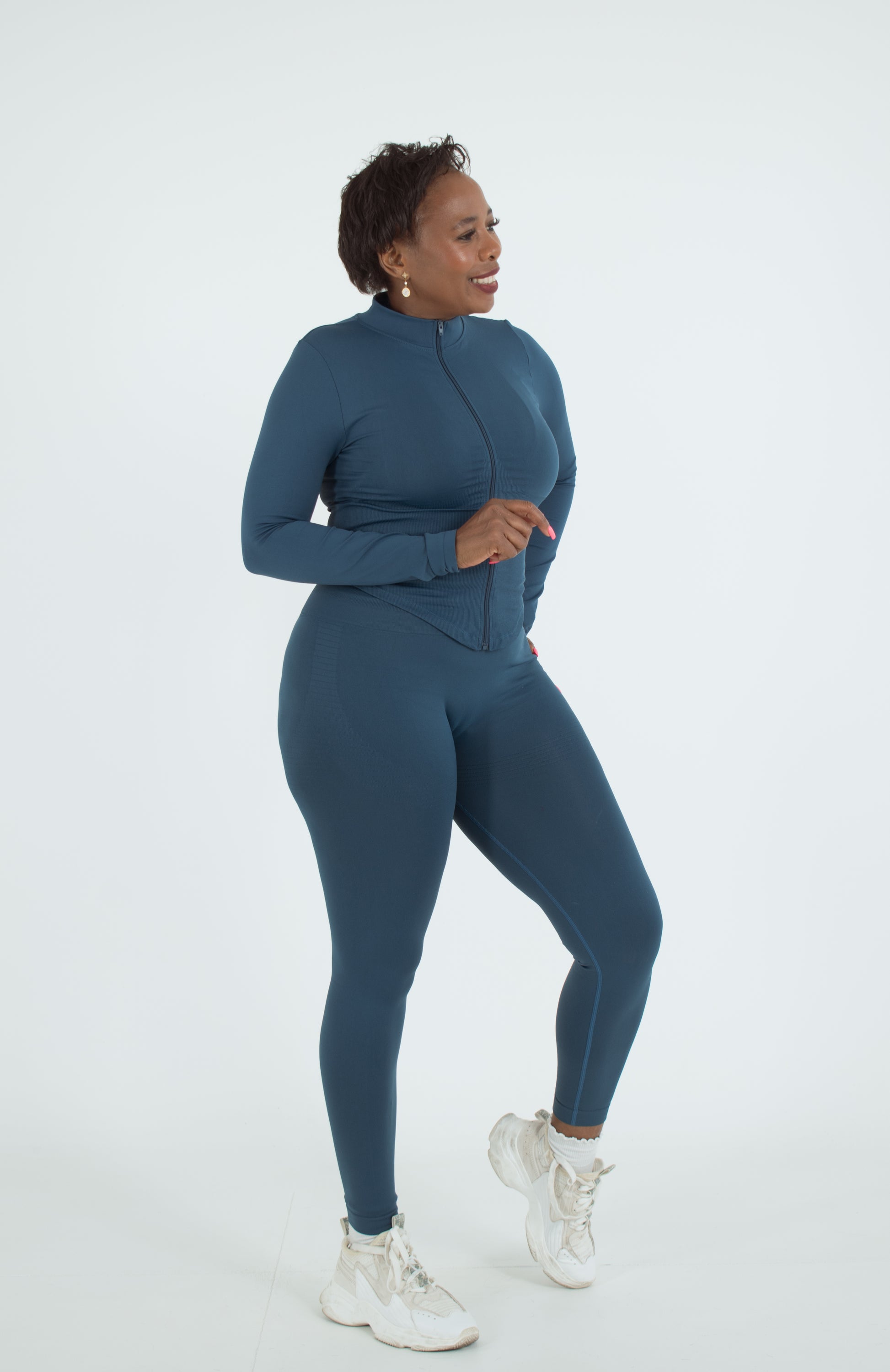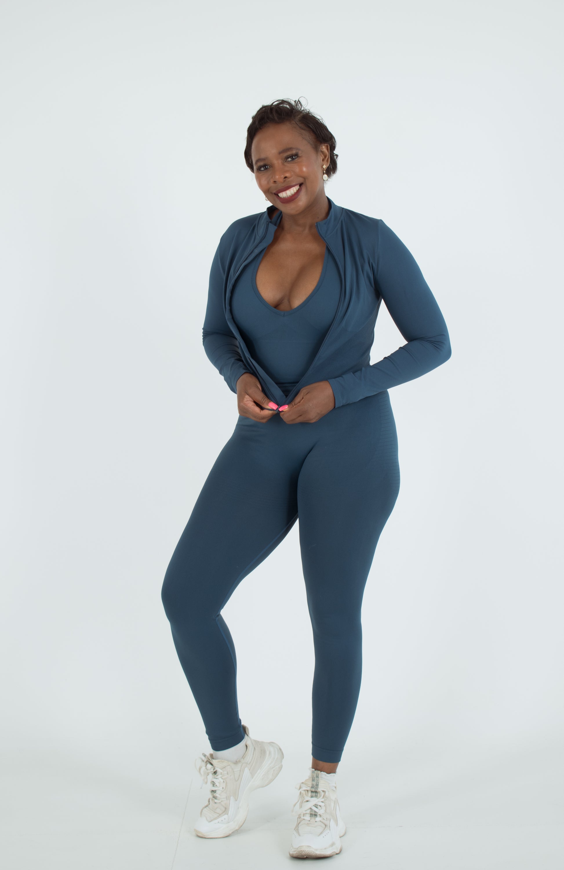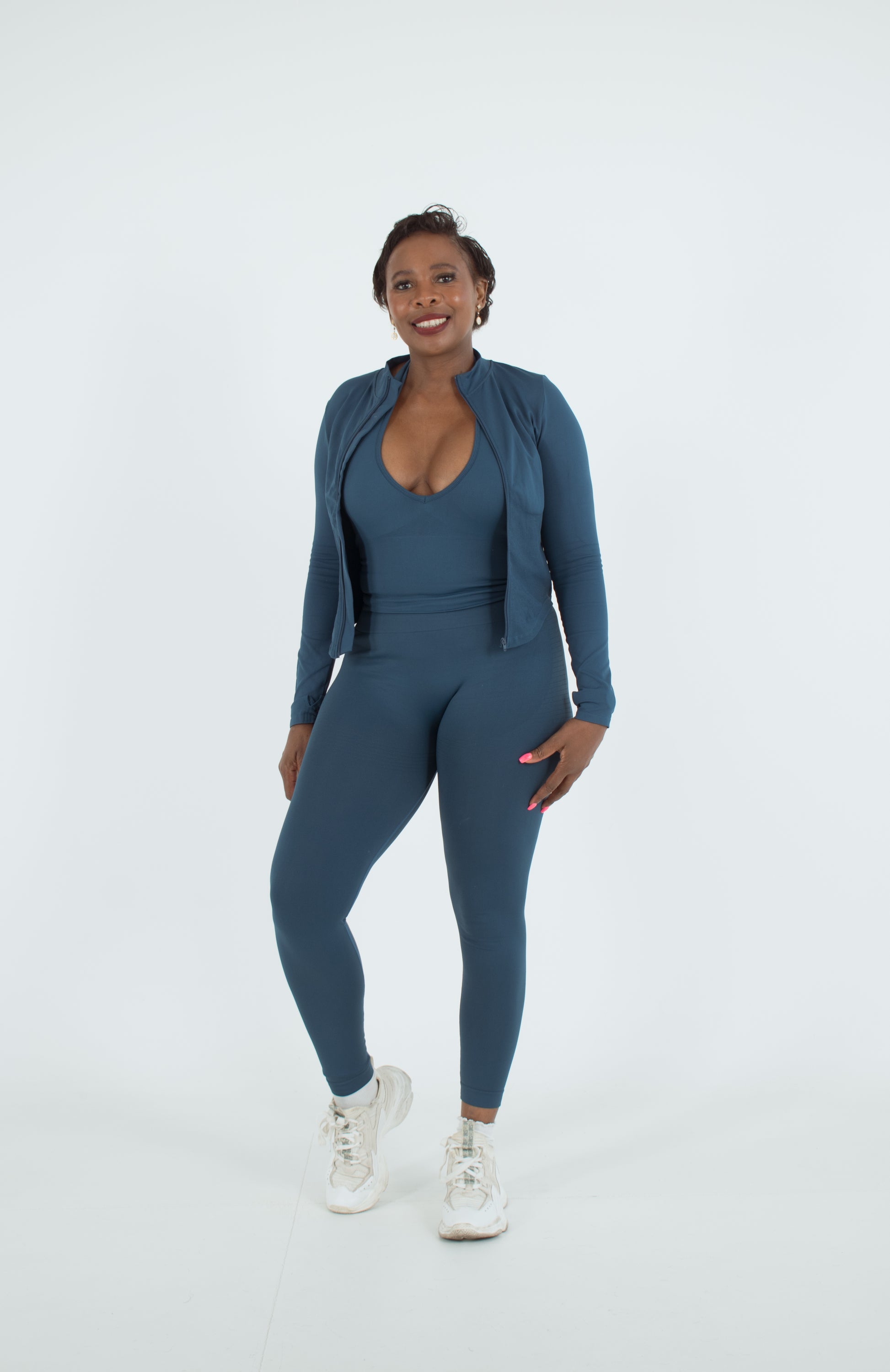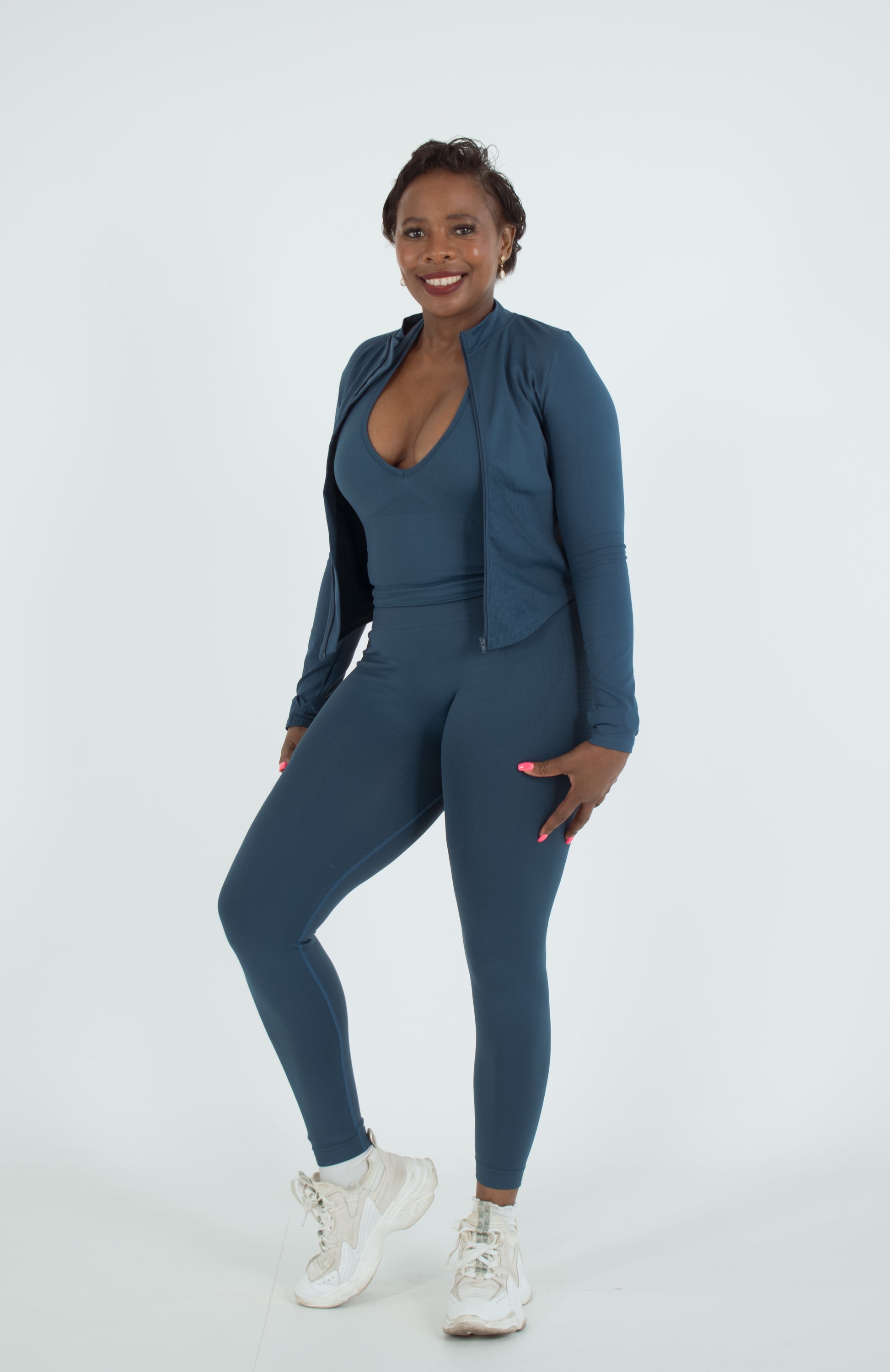 ✔️ Three-piece design – Includes a fitted crop top, high-waisted leggings, and a cozy zip-up jacket.
